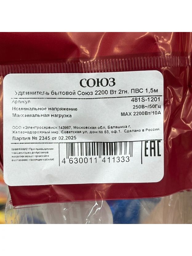 Удлинитель бытовой 2 гнезда, 1.5 м, ПВС, без заземления, 2200 Вт, Союз, 481S-1201