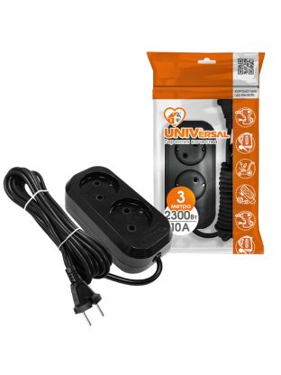 Удлинитель бытовой 2 гнезда, 3 м, ПВС, 2х0.75 мм2, без заземления, черный, UNIVersal, Премиум, Е-202, 2104