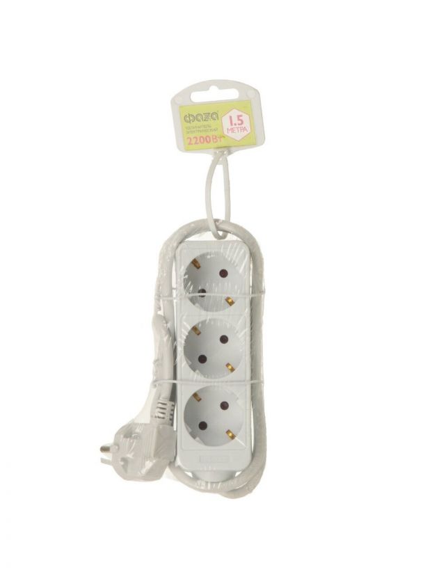Удлинитель бытовой 3 гнезда, 1.5 м, ПВС, 3х0.75 мм2, с заземлением, 10 А, пластик, белый, ФАZА, FEG-03-150, 5052833