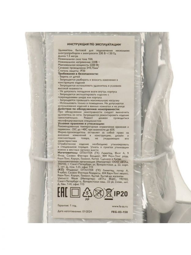 Удлинитель бытовой ФАZА FEG-03-150 — надежное решение для организации электропитания в доме, квартире или на даче. Практичность и универсальность делают его незаменимым помощником при подключении бытовой техники, электроинструментов и различных устройств в местах, где стандартных розеток недостаточно или они расположены неудобно. Благодаря оптимальной длине кабеля 1,5 метра, легко создать комфортные условия для работы и отдыха, не ограничивая себя в выборе места установки техники.
