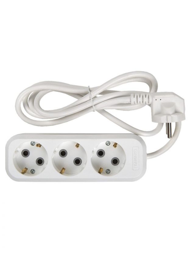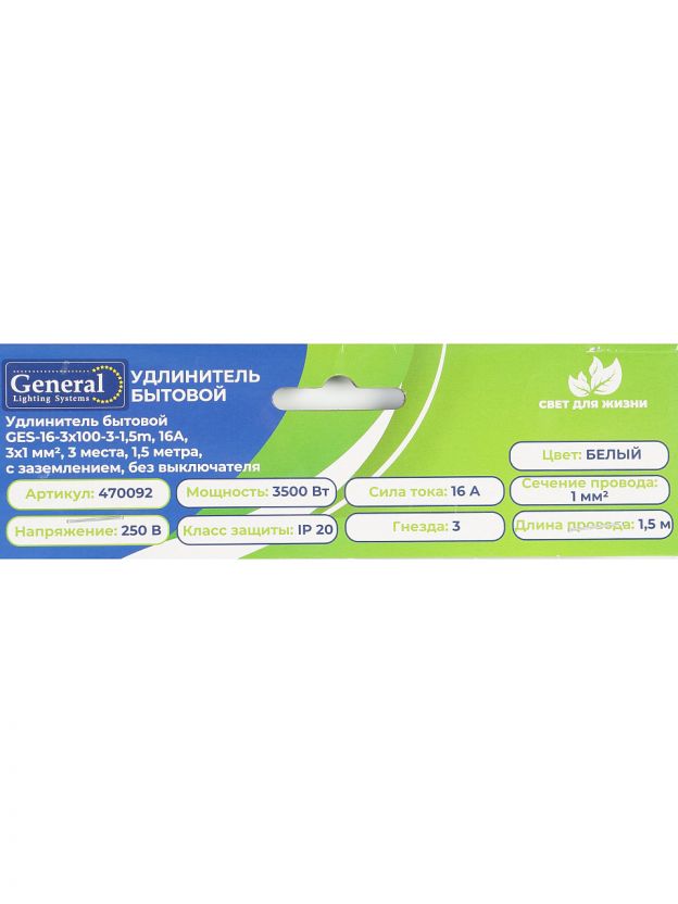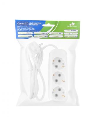 Удлинитель бытовой 3 гнезда, 1.5 м, ПВС, 3х1 мм2, с заземлением, 10 А, 3500 Вт, General Lighting Systems, 470092
