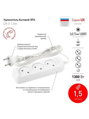 Бытовой удлинитель ЭРА UX-3-1,5m рассчитан для подключения простых бытовых приборов стандартной мощности. Гибкий двухжильный провод ШВВП длиной 1,5 метра. Максимальная нагрузка - 6 A/ 1300 Вт. Базовый белый цвет, аккуратный дизайн с закруглёнными углами. Для комфорта и безопасности гнёзда слегка "утоплены" в корпус. Изготовлен из надёжного полипропилена со специальными антипиренами, препятствующими горению.