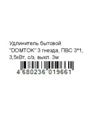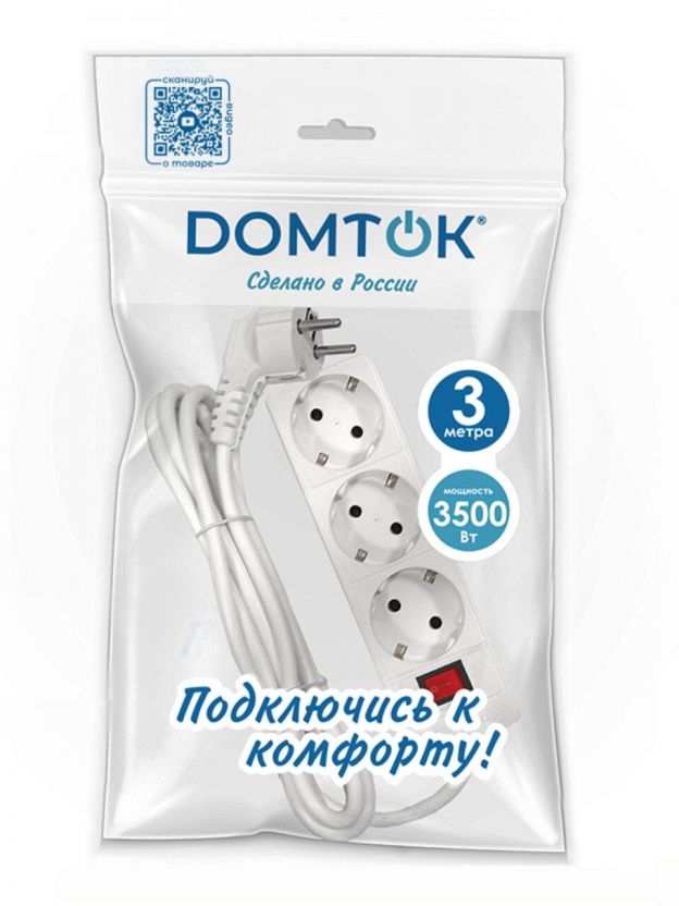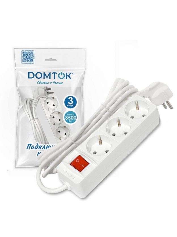 Удлинитель Domtok 2381: 3 розетки, 3 м, с заземлением и выключателем — безопасное подключение техники до 3500 Вт дома и на даче.