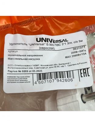 Удлинитель бытовой 3 гнезда, 3 м, ПВС, 3х1 мм2, с заземлением, UNIVersal, Е-303, 9631977