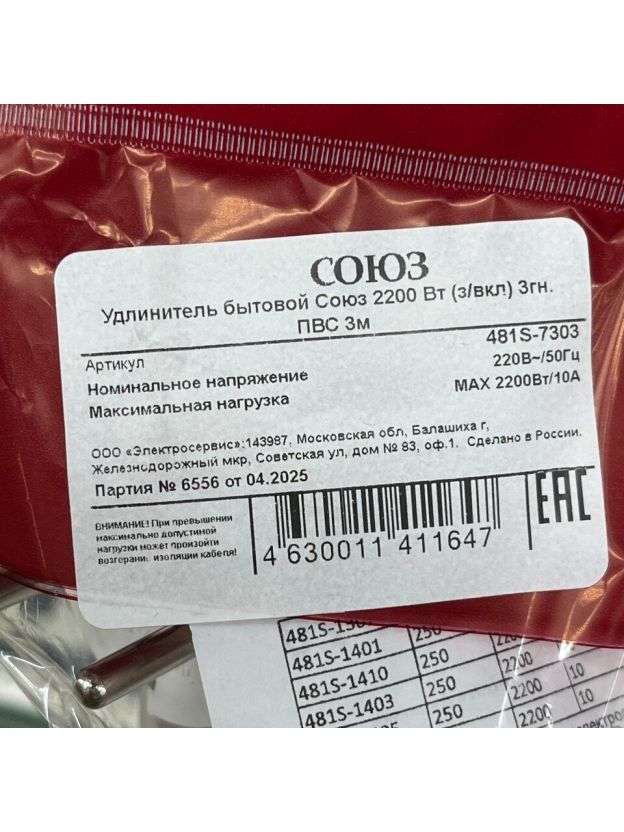 Удлинитель бытовой 3 гнезда, 3 м, ПВС, с заземлением, выключатель, 2200 Вт, Союз, 481S-7303