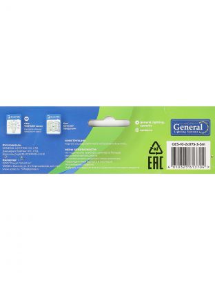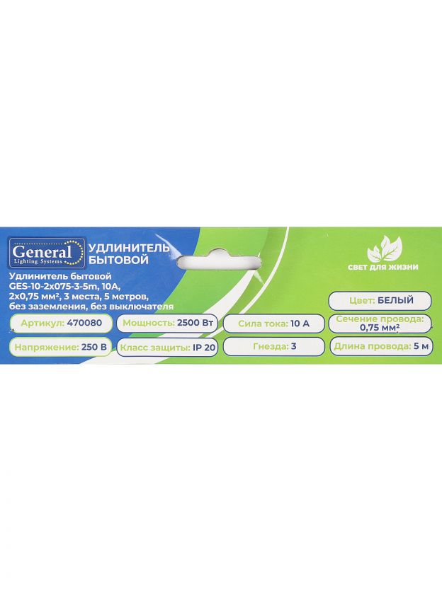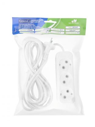 Удлинитель бытовой 3 гнезда, 5 м, ПВС, 2х0.75 мм2, без заземления, 10 А, 2200 Вт, General Lighting Systems, 470080