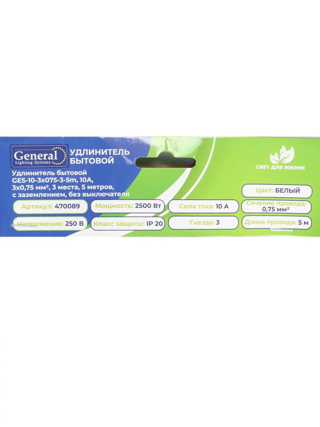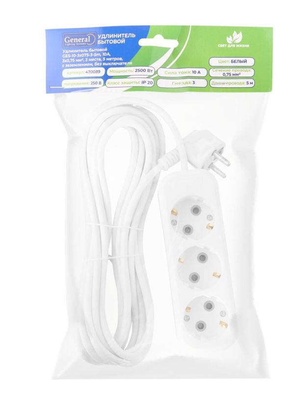 Удлинитель бытовой 3 гнезда, 5 м, ПВС, 3х0.75 мм2, с заземлением, 10 А, 2200 Вт, General Lighting Systems, 470089