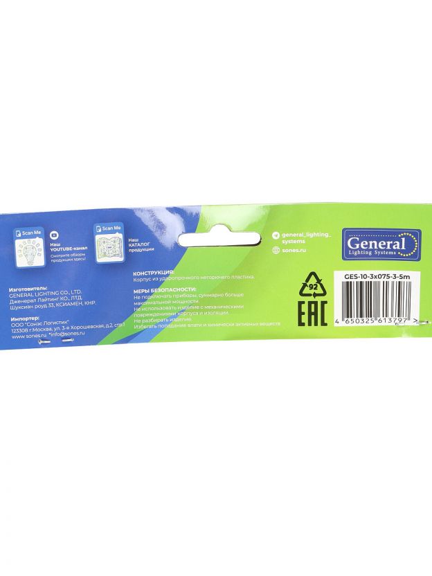 - Длина 5 метров и провод ПВС 3х0.75 мм2 — оптимально для размещения в любой комнате или на даче, гарантия 36 месяцев.