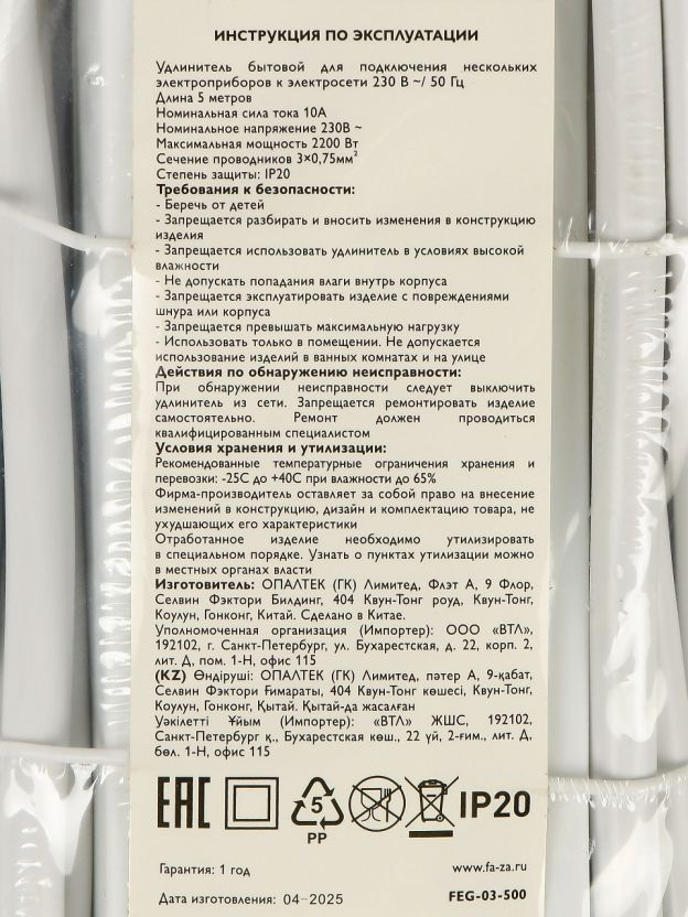 Удлинитель бытовой ФАZА FEG-03-500 на 3 гнезда с заземлением — это практичное решение для безопасного и удобного подключения техники в доме, на даче или в офисе. Благодаря длине кабеля 5 метров и оптимальному сечению провода 3х0.75 мм2, вы получаете свободу размещения даже в больших помещениях или удалённых уголках. Белый термостойкий пластик корпуса не желтеет со временем и защищает внутренние элементы от повреждений.