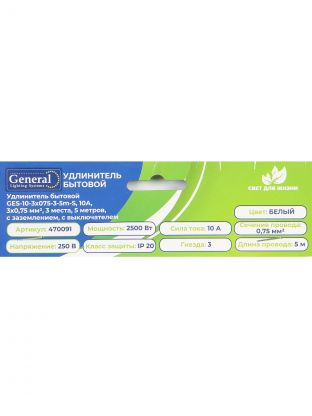 Удлинитель бытовой 3 гнезда, 5 м, ПВС, 3х0.75 мм2, с заземлением, 10 А, выключатель, 2200 Вт, General Lighting Systems, 470091