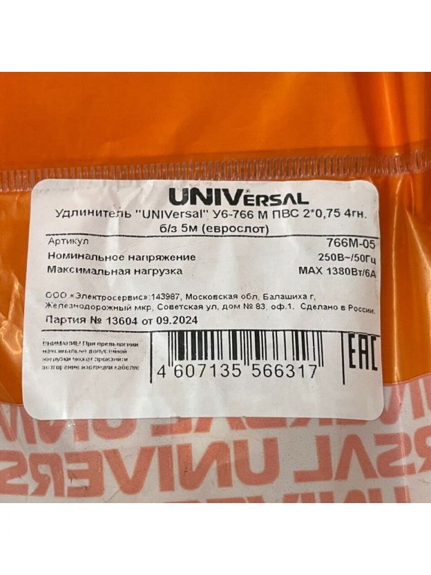 Удлинитель бытовой 4 гнезда, 5 м, ПВС, 2х0.75 мм2, без заземления, UNIVersal, У6, 766М-05