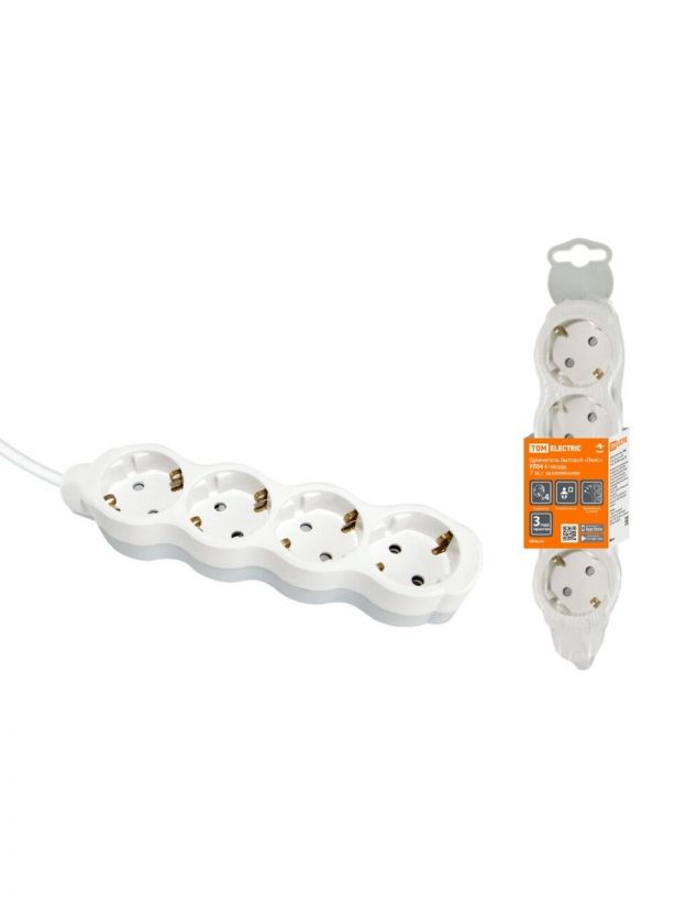 Удлинитель бытовой 4 гнезда, 7 м, ПВС, 3х1 мм2, с заземлением, 16 А, бело-серый, TDM Electric, Люкс, SQ1303-0283
