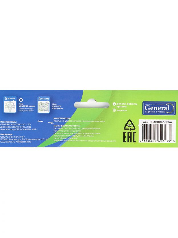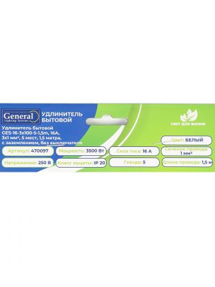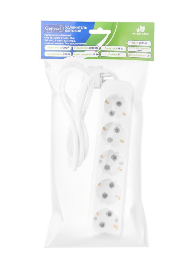 Удлинитель бытовой 5 гнезд, 1.5 м, ПВС, 3х1 мм2, с заземлением, 16 А, 3500 Вт, General Lighting Systems, 470097