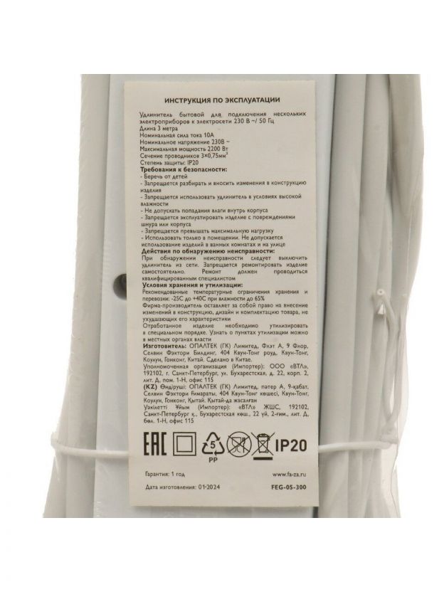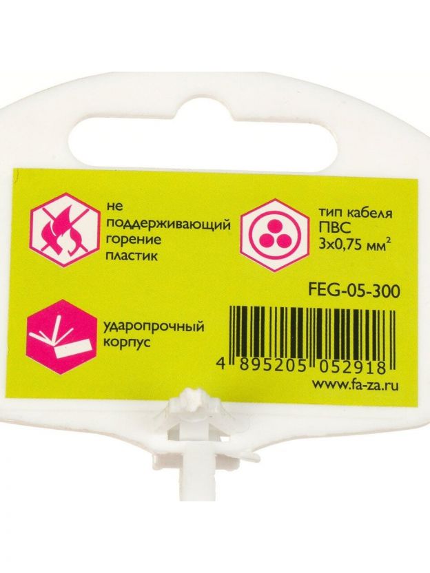Удлинитель бытовой 5 гнезд, 3 м, ПВС, 3х0.75 мм2, с заземлением, 10 А, пластик, белый, ФАZА, FEG-05-300, 5052918