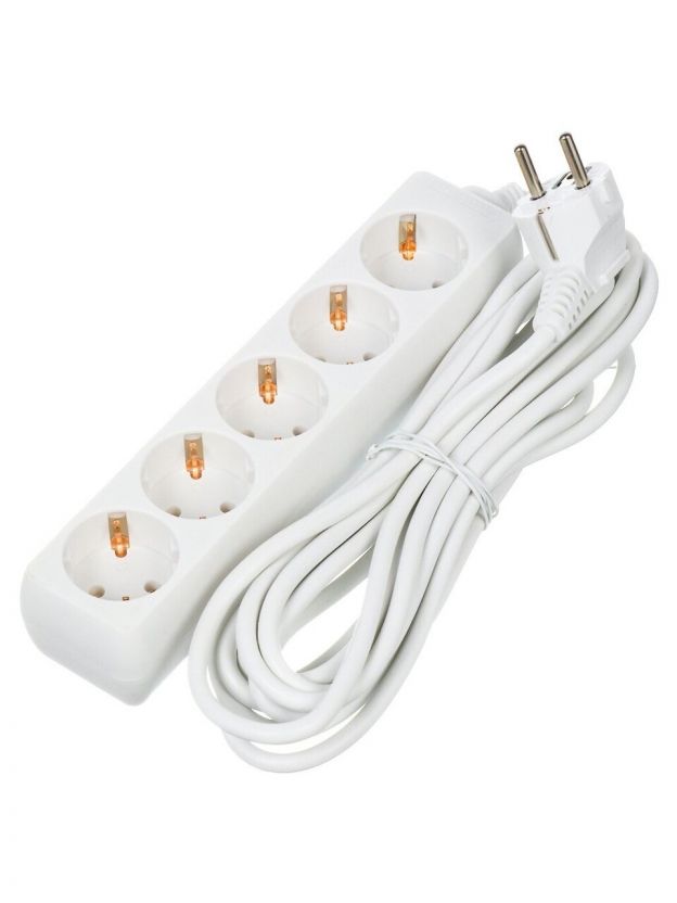 Удлинитель бытовой 5 гнезд, 5 м, ПВС, 3х1 мм2, с заземлением, 16 А, белый, General Lighting Systems, 470011