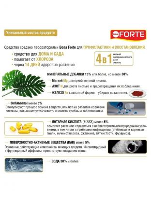 Удобрение 4 в 1 Bona Forte создано для восстановления истощенной почвы и повышения иммунитета растений. Подходит для алоказии, аспарагуса, антуриума, диффенбахии, драцены, клатеи, кротона, колеуса, маранты, монстеры, плюща, сансевиерии, фатсии, фикусов, финика, филодендрона, ховеи, юкки и многих других. Здоровье – первый и основной шаг к красоте декоративных растений. Удобрение содержит полный комплекс веществ, необходимых для полноценного и сбалансированного питания растений:
