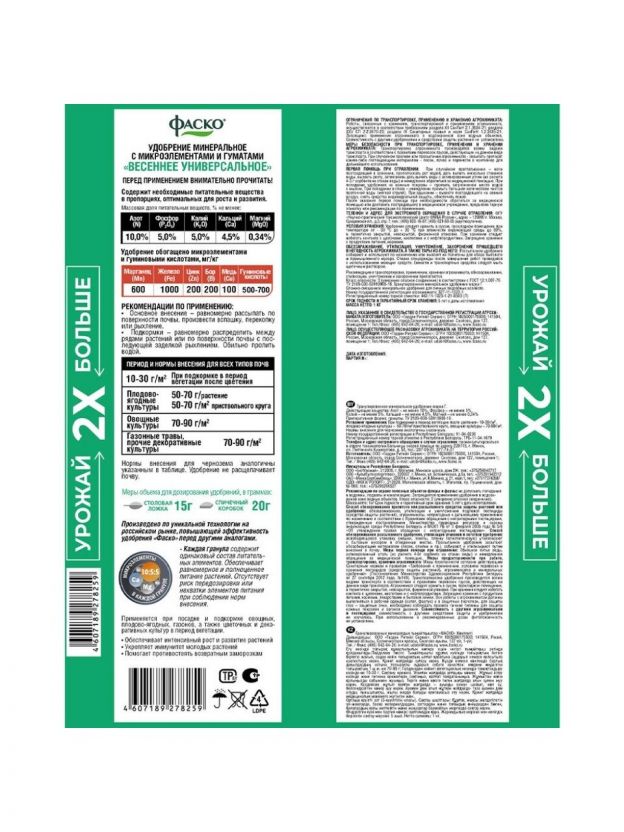 - Внесение весной под перекопку (вспашку, рыхление) почвы: Овощные культуры (окультуренная почва) - 70-90 г/м2; Овощные культуры (неокультуренная почва) - 90-120 г/м2.