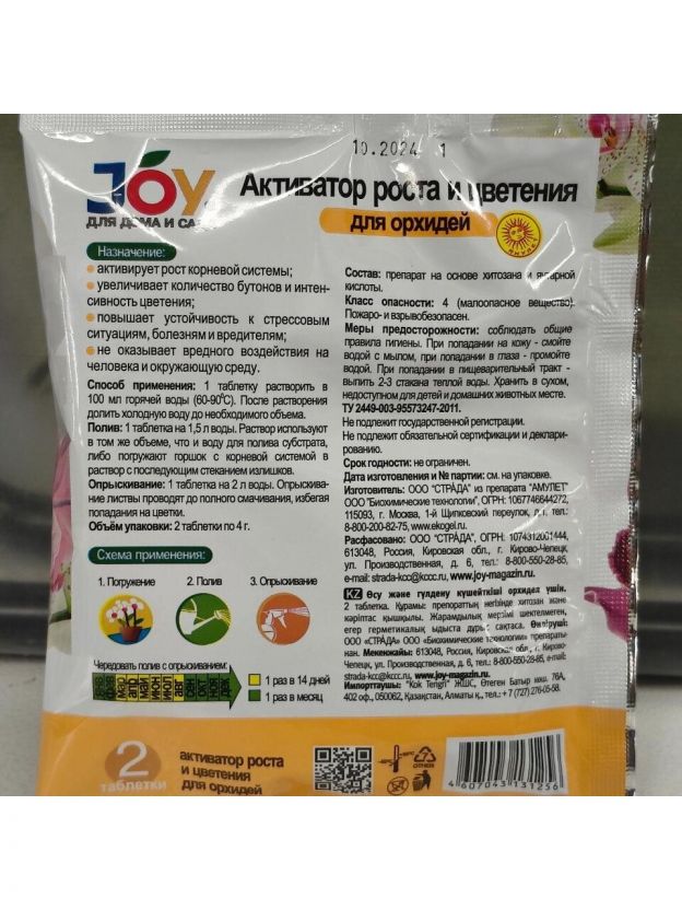 Удобрение Активатор роста и цветения, для орхидей, 2 шт по 4 гр, для орхидей, таблетки, 4 г, Joy