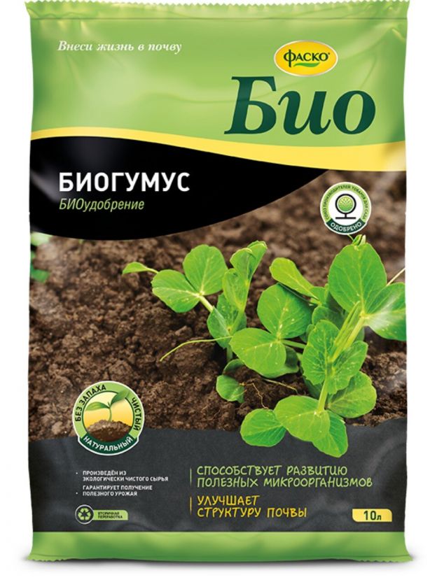 Био Биогумус содержит как органические, так и минеральные компоненты, что обеспечивает ускоренный рост, защиту от болезней и вредителей, а также улучшает структуру почвы. Форма выпуска — гранулы, объём — 10 л, страна производства — Россия.