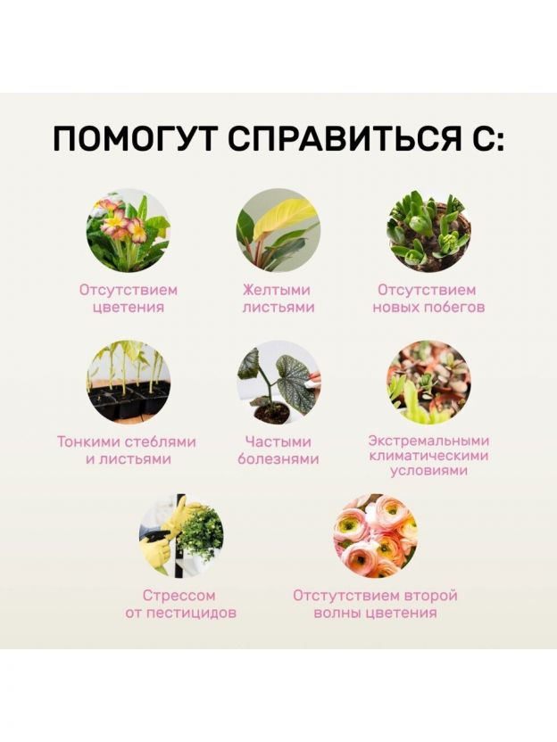 - Уникальная формула — биомолекулярный стимулятор роста для всех видов комнатных и садовых цветов.