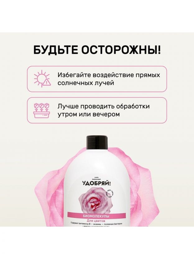 Удобрение Биомолекулы — органический стимулятор для цветов, который обеспечивает интенсивный рост, крепкий иммунитет и обильное цветение. Формула на основе природных биомолекул подходит для всех популярных видов декоративных растений: от комнатных фиалок до уличных роз. Благодаря жидкой форме средство легко дозировать и использовать — просто добавьте в воду при поливе.