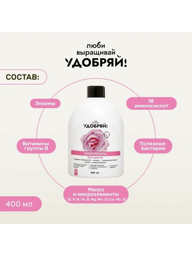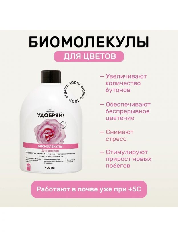 Удобрение Биомолекулы для цветов 400 мл — быстрый рост и яркое цветение без лишних хлопот. Органика для домашних и садовых цветов.