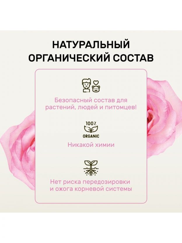 Идеально для поддержания роста, укрепления иммунитета и стимуляции цветения как комнатных, так и садовых цветов. Безопасно для частого применения, не вызывает засоления почвы.