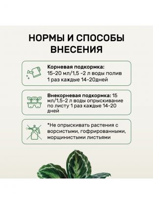 Растворите необходимое количество жидкости (по инструкции на упаковке) в воде и поливайте растения 1-2 раза в месяц. Удобрение подходит для регулярного применения в течение всего сезона.