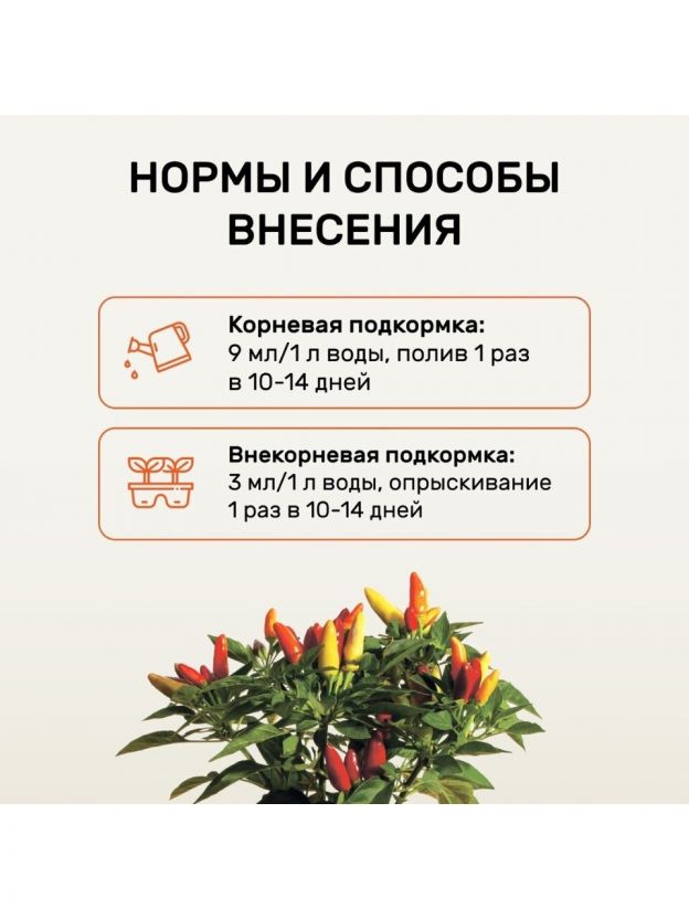 Разведите 10-20 мл удобрения в 1 литре воды и поливайте или опрыскивайте растения 1 раз в 7-10 дней. Подходит для томатов, огурцов, лука, зелени, перцев и баклажанов. Флакона 400 мл хватает на весь сезон.