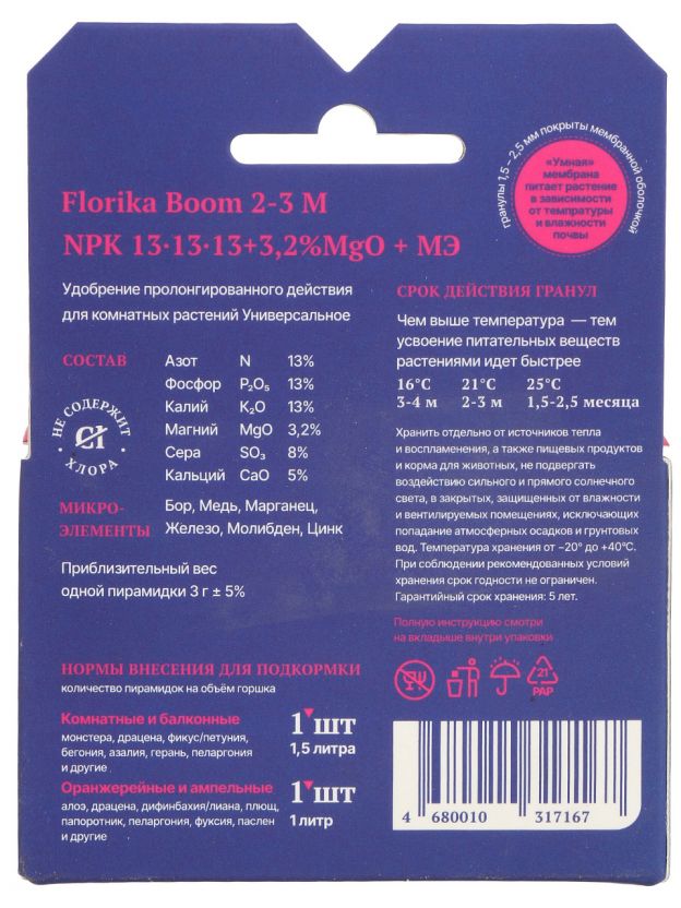 Таблетки Florika BOOM обеспечивают медленное и равномерное питание, не требуют частого внесения, не вызывают ожогов корней, подходят для длительного ухода без риска передозировки.