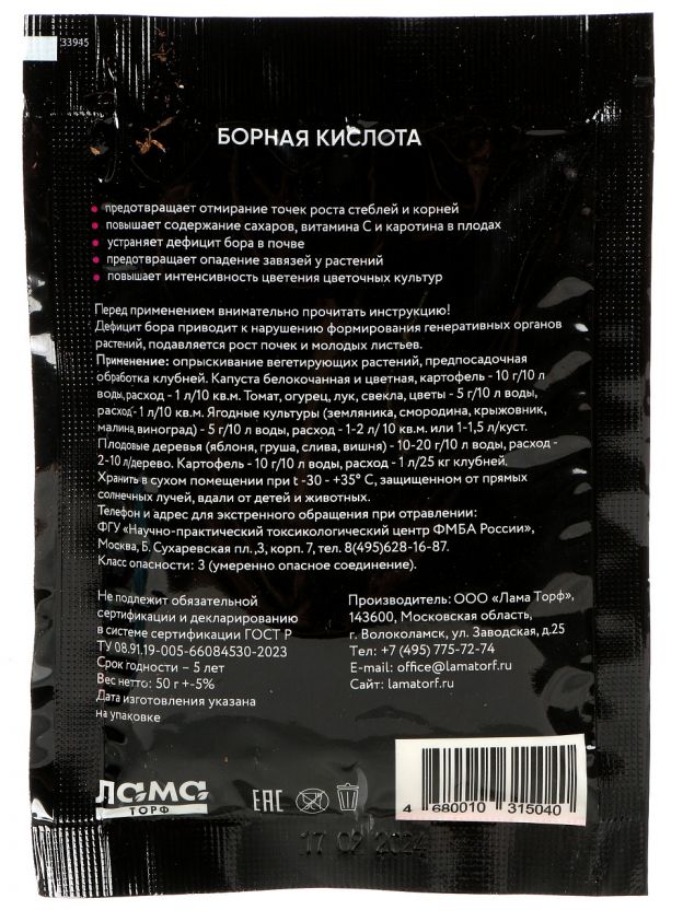 Закажите борную кислоту Лама Торф 50 г по выгодной цене — получите быструю доставку и поддержку эксперта по применению. Сделайте первый шаг к здоровому урожаю!