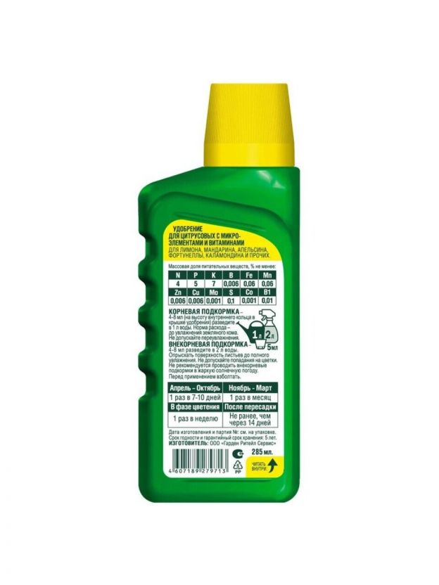 - Для корневой и внекорневой подкормки лимона, апельсина, мандарина, грейпфрута,лайма, цитрона, померанца.