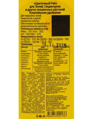 • Уникальная формула: минеральный стимулятор «Цветочный рай» активирует рост и защищает от болезней, подходит для всех луковичных цветов.