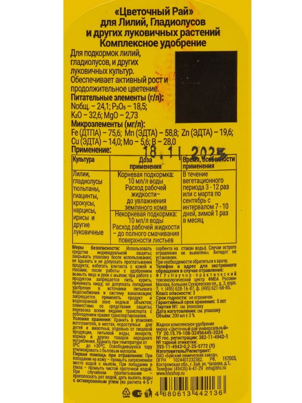 Жидкое удобрение для лилий, гладиолусов и других луковичных цветов «Цветочный рай» от Буйского химического завода — это профессиональное решение для садоводов, желающих купить недорогое удобрение для дачи и гарантировать здоровый рост своим растениям. Благодаря сбалансированному минеральному составу, средство подходит для регулярного применения в любой сезон: весной, летом, осенью и даже зимой при домашнем выращивании. Формула действует как стимулятор и защитная добавка, предотвращая распространённые болезни луковичных, повышая устойчивость к стрессам и увеличивая декоративность цветения.