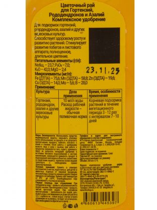 Удобрение Цветочный рай от Буйского химического завода — это минеральный стимулятор нового поколения, созданный специально для гортензий, рододендронов и азалий. Благодаря сбалансированному составу микро- и макроэлементов, средство ускоряет рост, усиливает цветение, помогает растениям справляться с болезнями. Формула подходит для всех сезонов — весна, лето, осень, зима, что особенно важно для круглогодичного ухода.