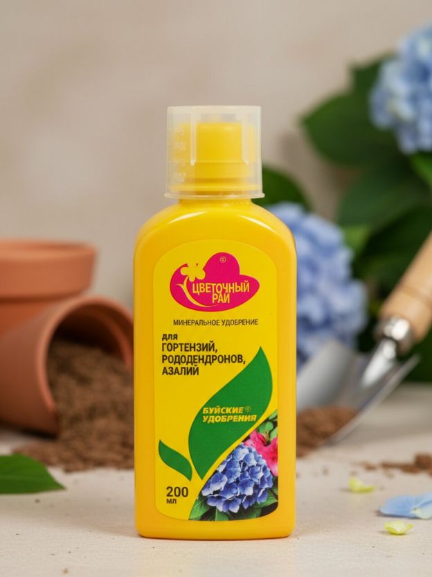 Удобрение Цветочный рай для гортензий, рододендронов и азалий — быстрый рост, яркое цветение, защита от болезней в любом сезоне, 200 мл.