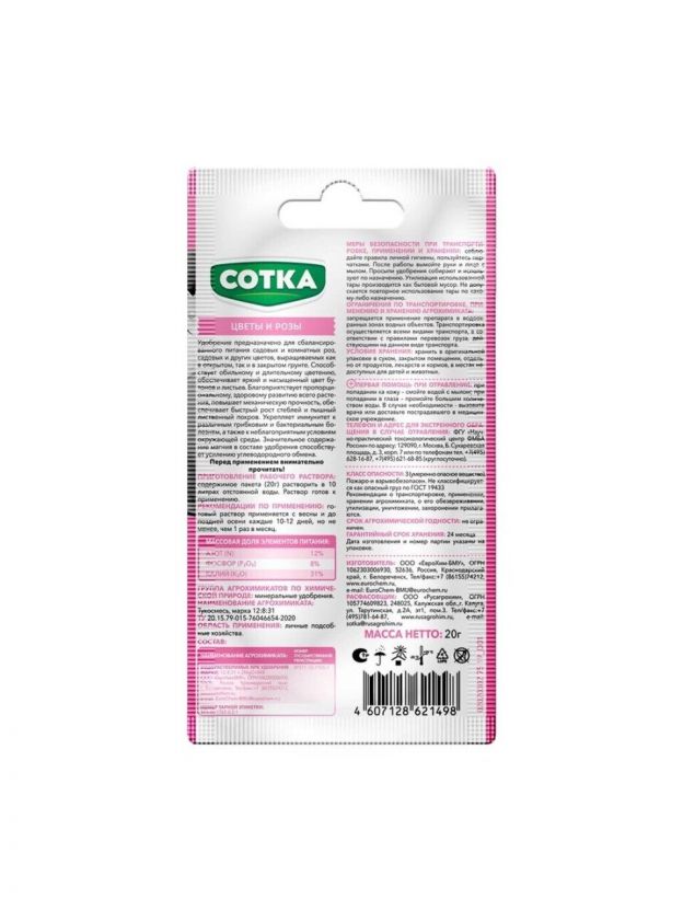 Минеральное водорастворимое удобрение для цветов и роз 20г Сотка стик – отличный выбор для яркого и обильного цветения любимых растений. Специально разработанная формула способствует активному росту и развитию, насыщая почву необходимыми элементами. Идеально подходит для ухода за розами и цветами в весенний период, обеспечивая долгий и пышный цветущий сад.