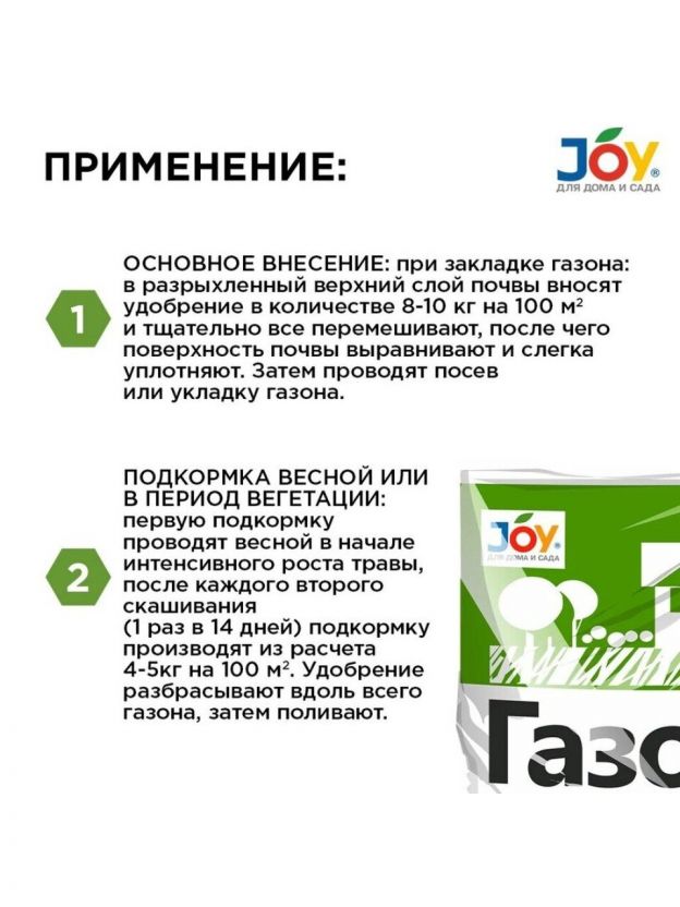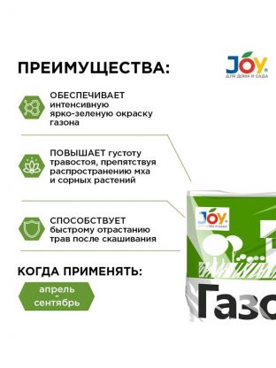 Минеральное азотное удобрение Joy для газонных трав станет отличным помощником садовода любителя. Если вы хотите восстановить газон после зимнего периода или обновить его - это удобрение для весеннего внесения отлично подойдет для посева семян всех видов газонных трав.