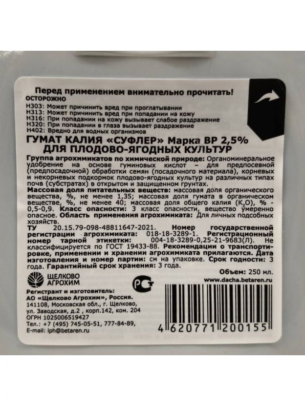 Удобрение Гумат калия Суфлер, для плодово-ягодных, органоминеральное, жидкость, 250 мл, Щелково Агрохим