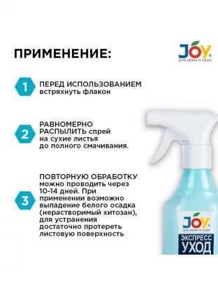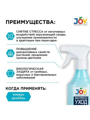 JOY Экспресс уход для комнатных растений – минеральное комплексное удобрение с микроэлементами. Применяется в качестве внекорневой подкормки для всех комнатных растений. Препарат стимулирует активный рост и корнеобразование, повышает декоративные свойства растений, продлевает срок цветения, обеспечивает биологическую защиту от грибковых, вирусных и бактериальных заболеваний, снимает стресс от негативных воздействий окружающей среды, улучшает приживаемость и адаптацию при пересадке. Полностью готов к применению.