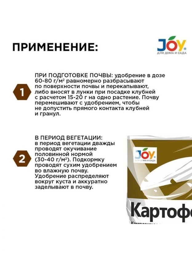 Для этой овощной культуры важными веществами для качественного произрастания являются азотные и калийные удобрения. JOY "Картофель" станет вашим отличным помощником в выращивание картофеля, эта подкормка применяется на любых видах почв.