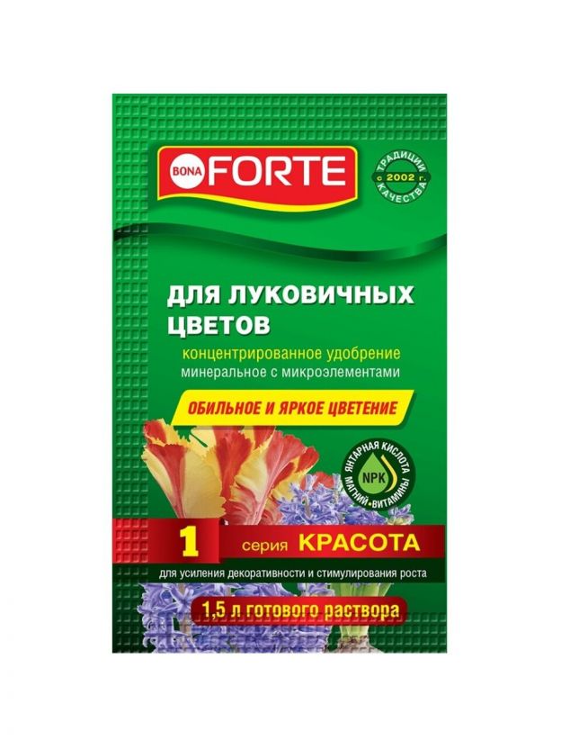 Серия Красота создана лабораториями Bona Forte для усиления декоративности и стимулирования роста растений. Подходит для крокусов, тюльпанов, нарциссов, гиацинтов, рябчиков, гладиолусов и других цветущих луковичных растений. Удобрение содержит полный комплекс веществ, необходимых для полноценного и сбалансированного питания растений.