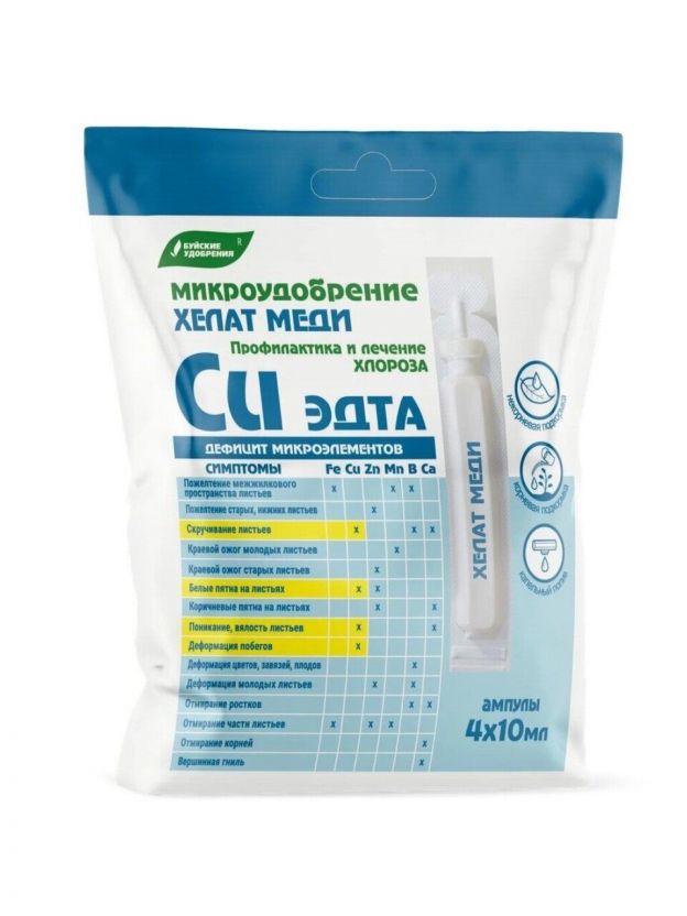 Представляем микроудобрение "Хелат меди" от Буйского химического завода — идеальное решение для заботы о рассаде, овощах и плодово-ягодных культурах. Это минеральное удобрение в жидкой форме, упакованное в удобные ампулы по 10 мл, станет надежным помощником в росте растений и защите от болезней в любое время года.