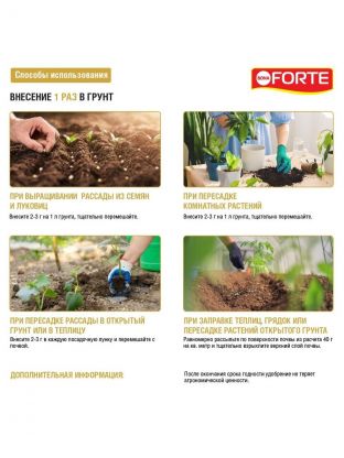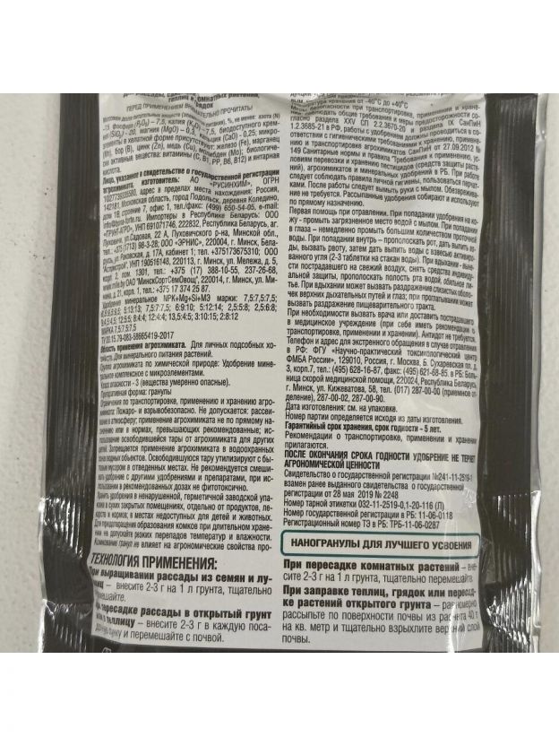 - Пролонгированное действие - благодаря входящему в состав удобрения цеолиту удобрение не вымывается со временем (одного внесения хватает на весь сезон).