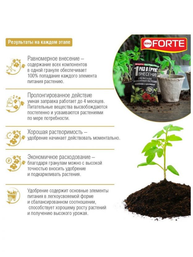 Наноудобрение Bona Forte подходит для комнатных растений, саженцев, рассады, а также заправки теплиц и грядок: повышает всхожесть семян, работает до 4 месяцев, стимулирует рост и развитие растений.