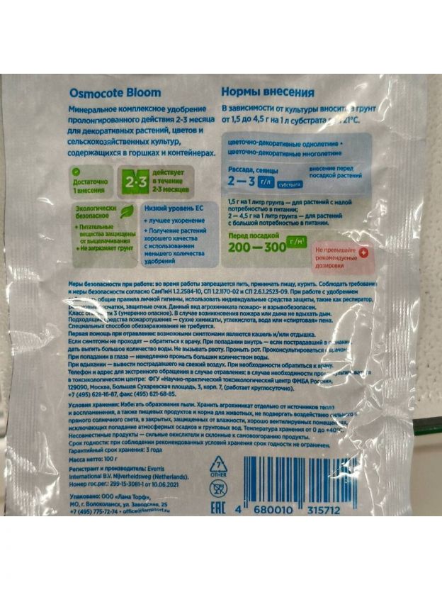 Osmocote Bloom – минеральное комплексное удобрение пролонгированного действия 2-3 месяца на основе соединений азота, фосфора и калия для декоративных растений, цветов и сельскохозяйственных культур, содержащихся в горшках и контейнерах.
