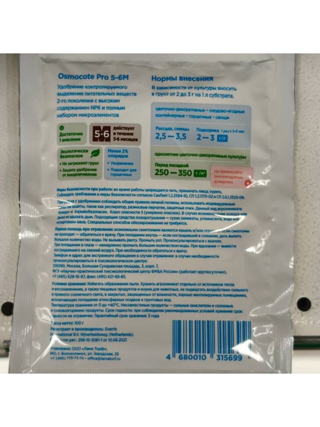 - Рекомендуемые нормы применения: Цветочно-декоративные, плодово-ягодные культуры (контейнерные, горшечные растения) — внесение при приготовлении питательного субстрата; подкормка 1 раз в 5-6 месяцев из расчета 2-3 гр/литр субстрата. Цветочно-декоративные культуры (однолетние) — внесение при приготовлении питательного субстрата для выращивания рассады из расчета 2,5-3,5 гр/литр субстрата. Цветочное-декоративные культуры (однолетние) — внесение перед посевом (посадкой) из расчета 250-350 гр/м.куб.