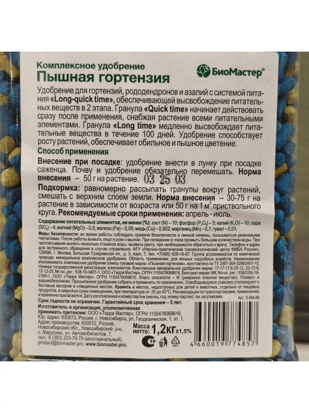 Удобрение Пышная гортензия, комплексное, минеральное, гранулы, 1200 г, БиоМастер