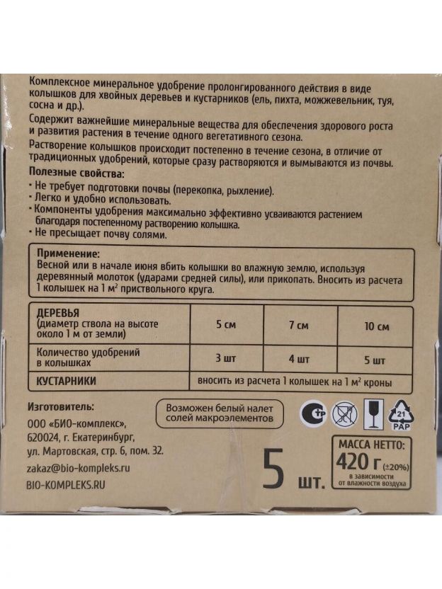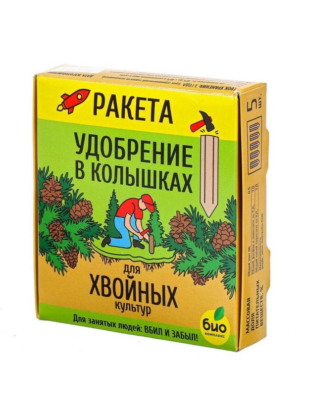 Комплексное минеральное удобрение Ракета Био-комплекс пролонгированного действия предназначено для хвойных деревьев и кустарников (ели, сосны, туи, пихты, можжевельники и пр.). Выпускается в виде колышков для личных садовых и подсобных хозяйств. Растворение удобрений происходит постепенно в течение всего вегетативного сезона, в отличие от традиционных удобрений, которые сразу растворяются и вымываются из почвы.