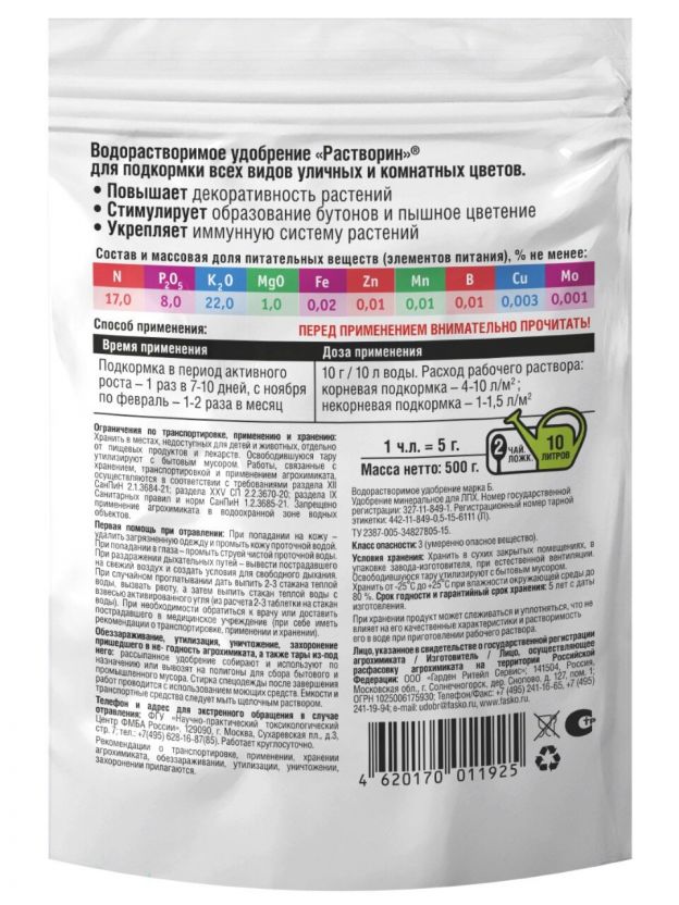 Удобрение Растворин Фаско 0,5 кг — быстрый рост цветов круглый год: минеральная подкормка для уличных и комнатных растений с максимальной эффективностью.
